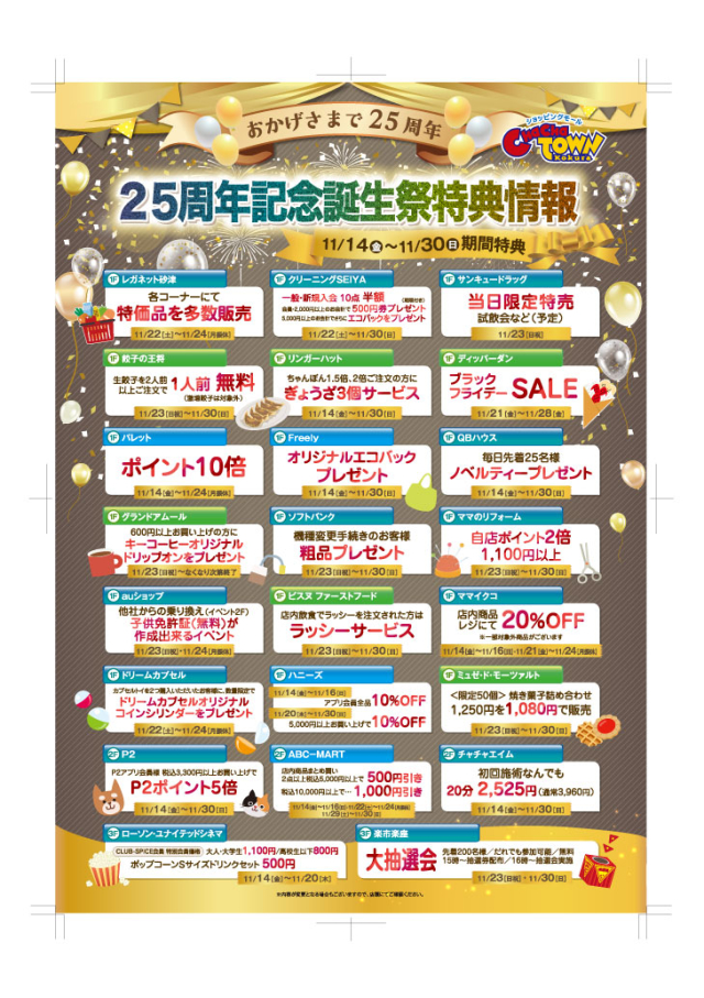 25年の感謝を込めて、お客様に喜んでいただけるイベントをたくさんご用意して皆様のお越しをお待ちしております。