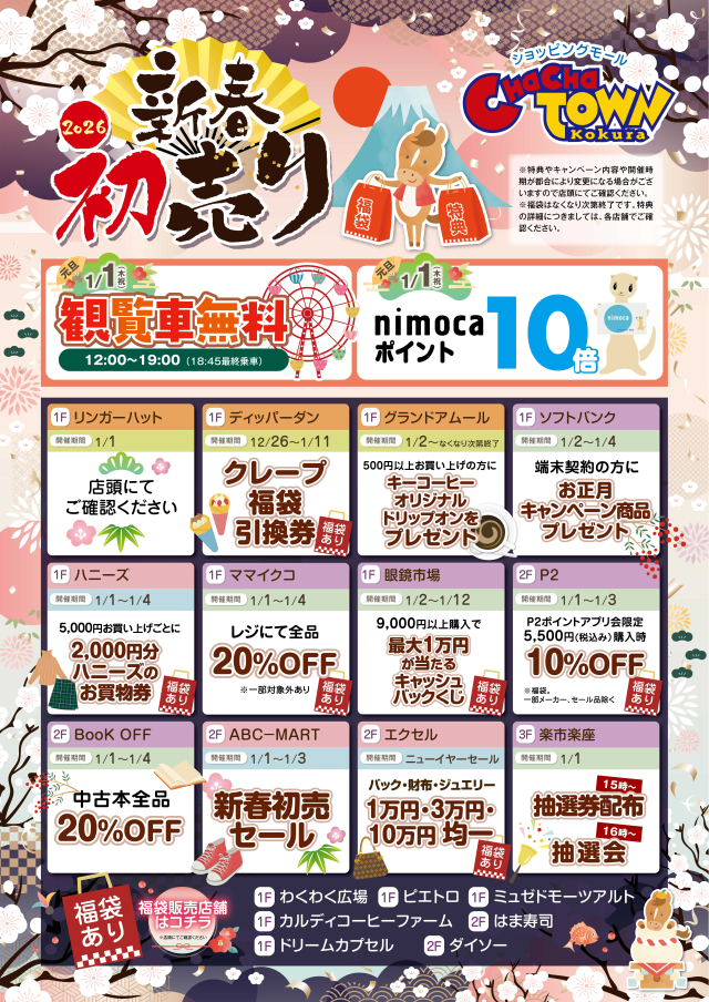 チャチャタウン小倉では、対象店舗にて特典サービス実施!! 福袋販売もございます。(各店舗にてご確認ください) 2026年もチャチャタウン小倉を、どうぞよろしくお願いいたします。