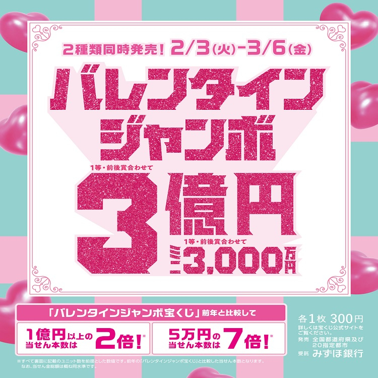 宝くじチャンスセンターでは 2月3日から3月6日まで、 2種類の『バレンタインジャンボ宝くじ』を同時発売。 1等・前後賞合わせて 3億円の 『バレンタインジャンボ宝くじ』 全国で1等 2億円が最大 11本、 1等の前後賞 5千万円が 最大 22本、更に2等も1億円に賞金がアップし、 1億円以上の当せんが最大 22本になりました。 また、『バレンタインジャンボミニ』は、 1等・前後賞合わせて 3千万円が最大 50本! 各1枚300円からご購入いただけます。 皆様のご来店を心よりお待ちしております。