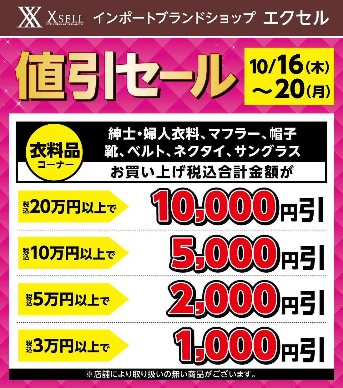 10/16(木)~20日(月) 5日間限定!! 期間中、紳士•婦人衣料、マフラー、帽子 靴、ベルト、ネクタイ、サングラスを お買い上げ税込合計金額が 税込20万円以上で10,000円引きに 税込10万円以上で5,000円引きに 税込5万円以上で2,000円引きに 税込3万円以上で1,000円引き致します⭐ ※店舗により取り扱いの無い商品がございます。 詳しくは店頭スタッフまで お気軽にお尋ねください